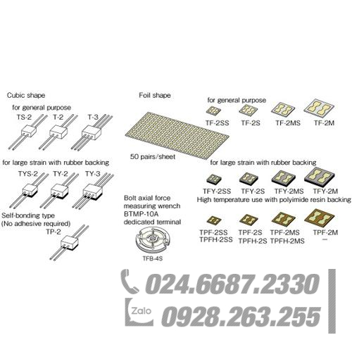 Dòng T được làm bằng nhựa hình khối và hai dây có đường kính khoảng 0,8 mm được cố định vào khối. TY được ép bằng tấm cao su và thích hợp để đo biến dạng lớn. TP-2 là thiết bị đầu cuối tự liên kết có hai dây. TF được làm bằng lá đồng dày 0,03mm và đế cách nhiệt bằng thủy tinh-epoxy khoảng. dày 0,15mm. TFY được ép với tấm cao su khoảng. Dày 0,8mm ở mặt sau của thiết bị đầu cuối dòng TF.